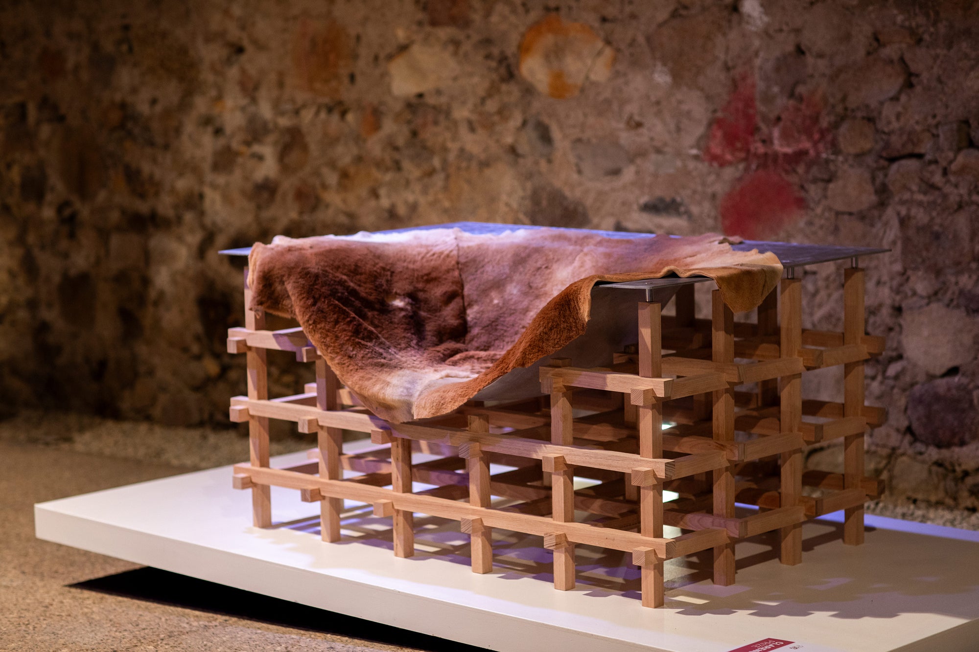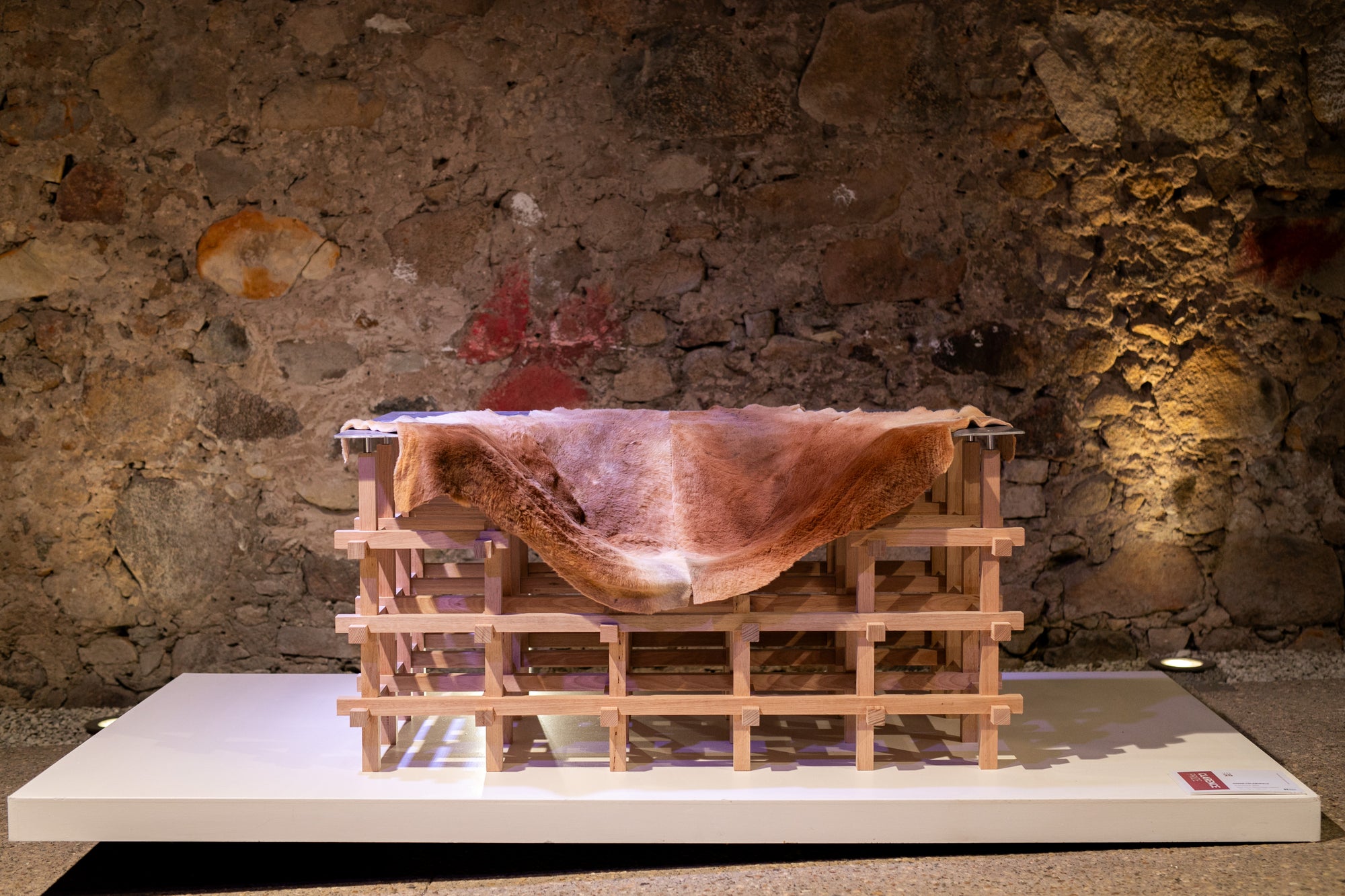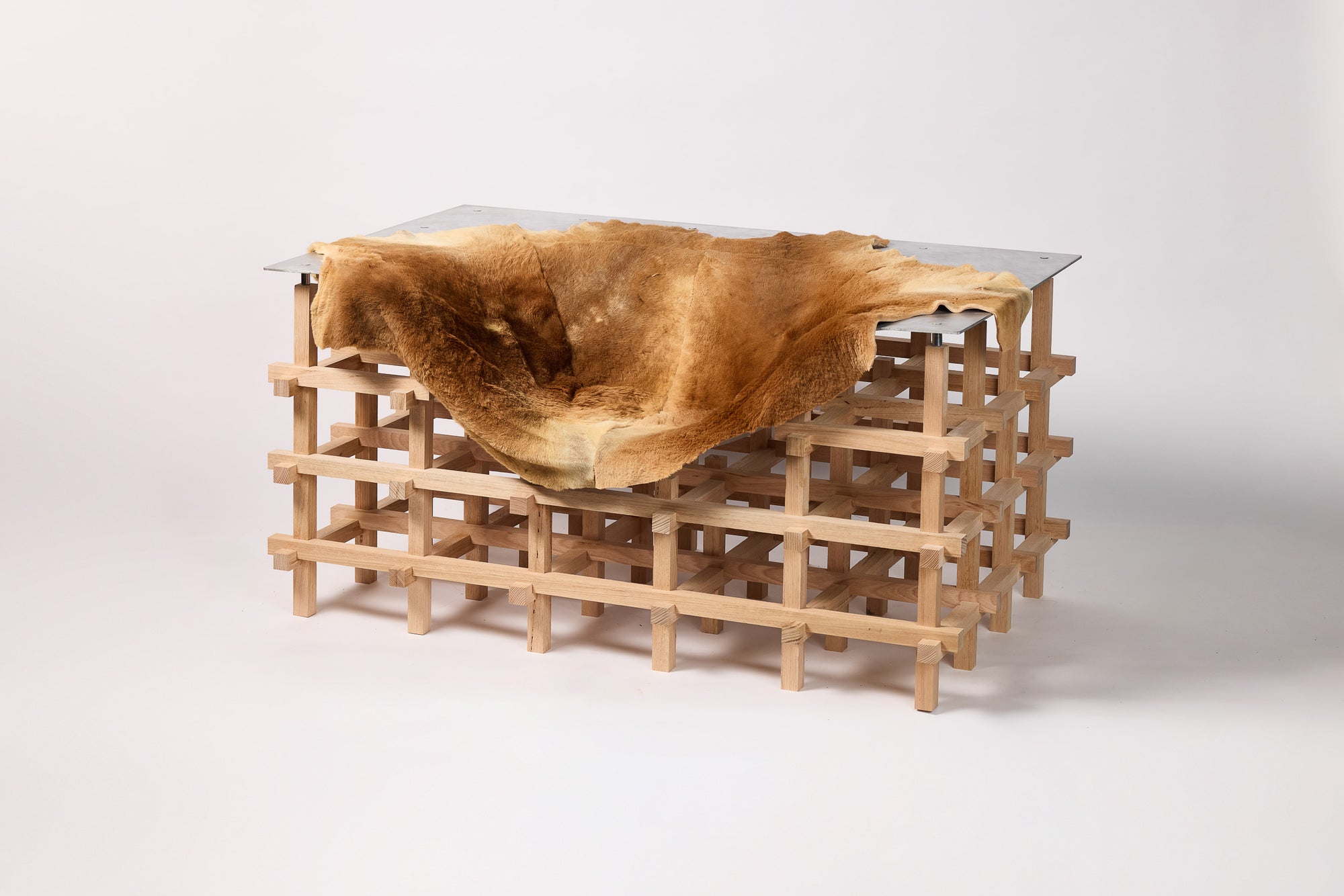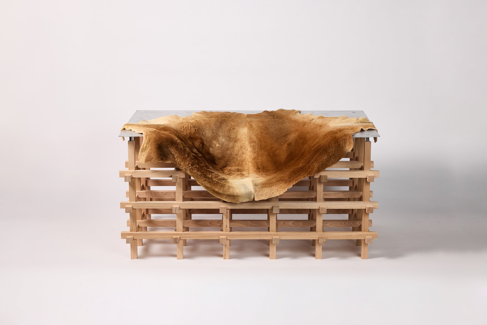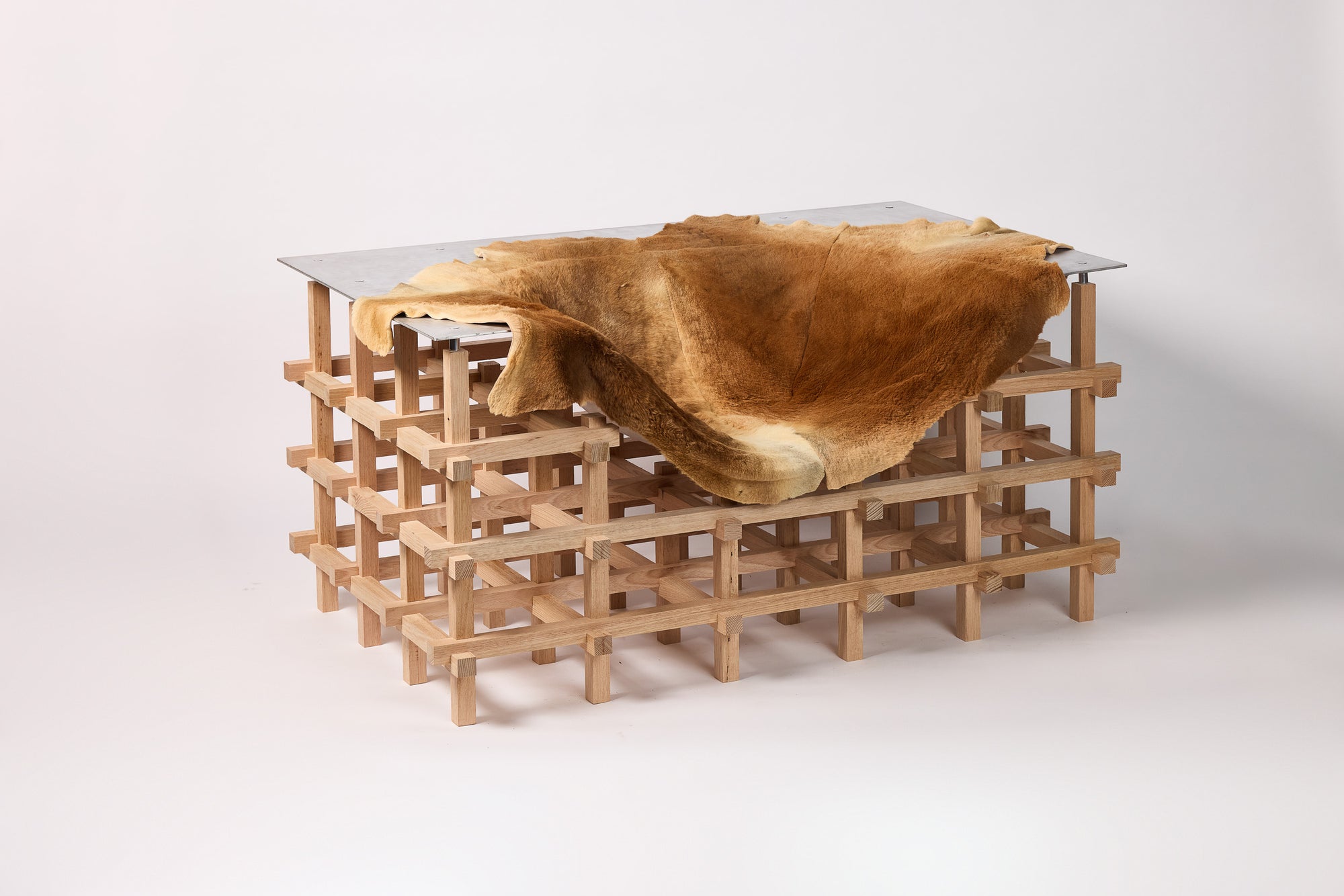 Cascade explores the dialogue between structure and fluidity. Its CNC-machined Tasmanian oak base forms a geometric grid, forming clean simple lines. Above it, a hand formed aluminium shell merges rigidity and softness in one form. The composition is completed by a kangaroo throw, left in its natural form, offering a distinctly Australian character, tactility, and contrast. Together, these three elements create a progression from the geometric to the organic, balancing craft, technology, and material expression.