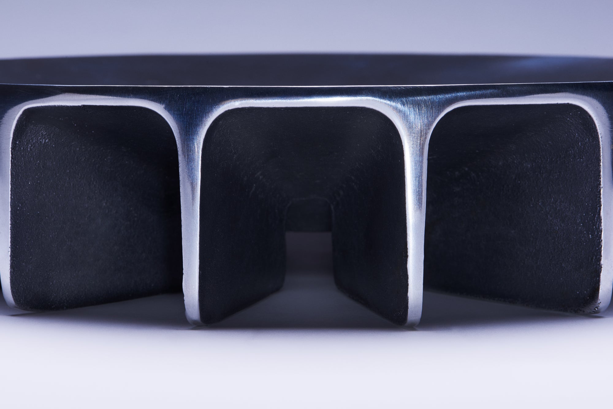 Inspired by early machinery Transfer's coarse sand cast surface are contrasted against the polished machined surfaces.